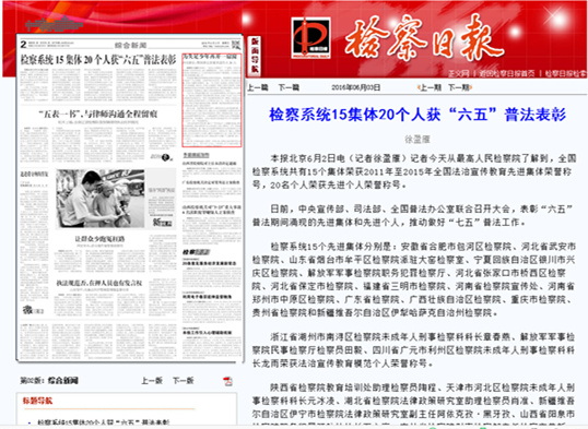 张家口长安网讯(桥西长安通讯员):5月26日,中央宣传部、司法部、全国普法办公室联合召开大会,表彰“六五”普法期间涌现的先进集体和先进个人,张家口市桥西区人民检察院荣获2011至2015年全国法治宣传教育先进集体荣誉称号,全国检察系统共有15个集体获此殊荣。