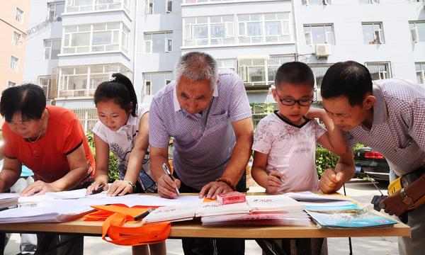 图为群众积极参与、认真阅读宣传手册,填写调查问卷。