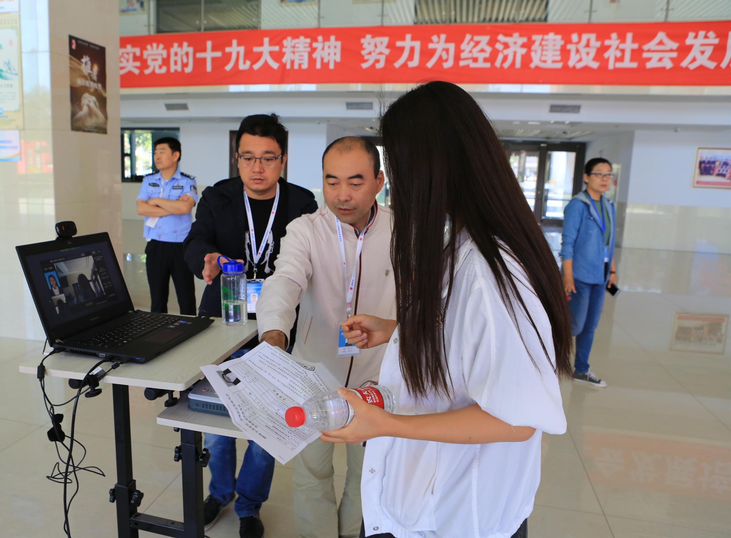 (图:考试现场工作人员对考生身份进行核对)
