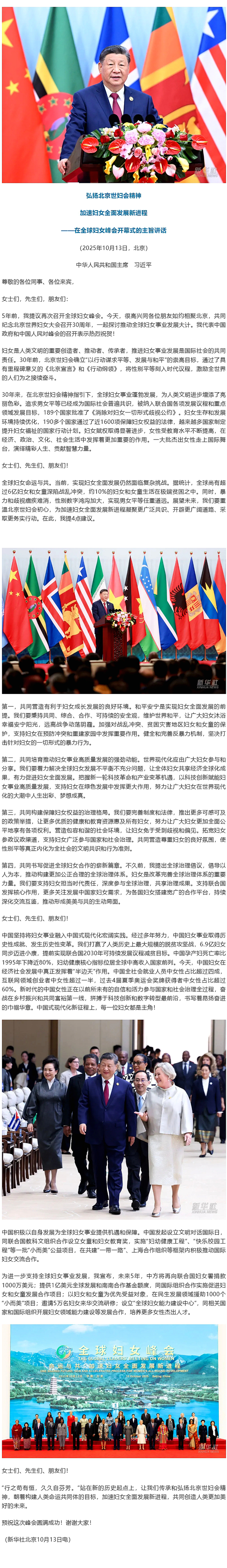 习近平在全球妇女峰会开幕式的主旨讲话(全文)