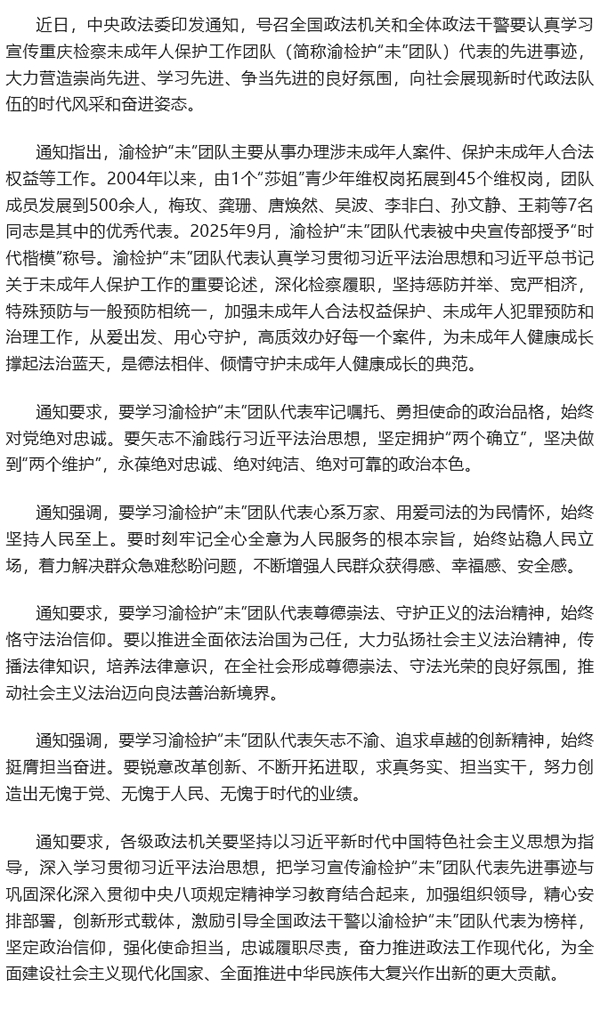 中央政法委印发通知要求学习宣传重庆检察未成年人保护工作团队代表先进事迹